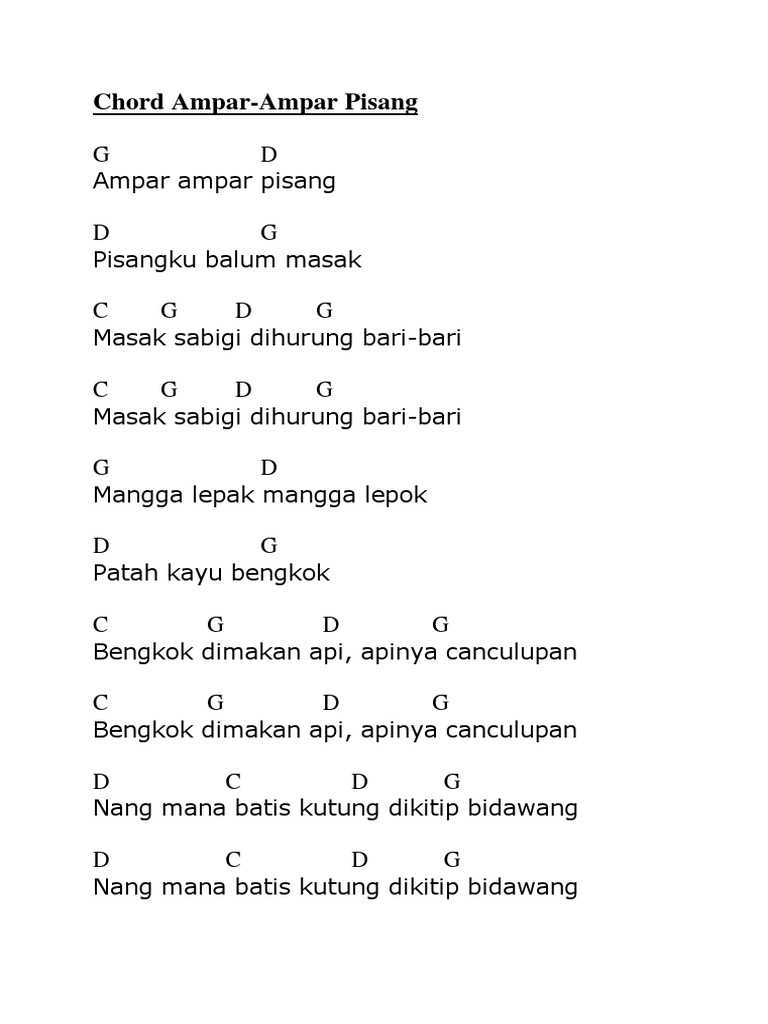 Chord lagu ampar ampar pisang. Jika anda belum bisa membaca notasi balok kami juga menyediakan lagu ini dalam format lain silahkan pilih yang cocok untuk anda. Lirik Lagu Daerah Tolaki Lamarambi. Lagu naya marupakan lagu khas matan Kalimantan Selatan wan dinyanyiakan oleh kakanakan sawagai lagu mairingi pamainan.