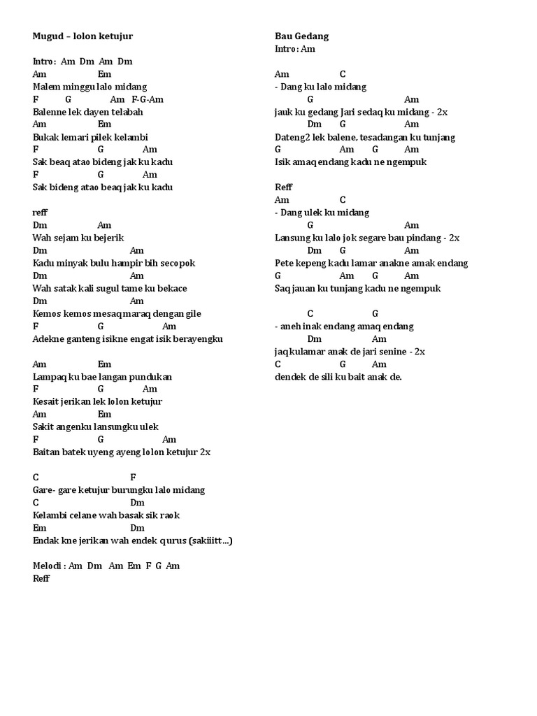 CHORDS USED Dm F Gm C Am capo fret 3 intro Dm verse 1 Dm F Gm mun bebeleq ariq te bolaq mamben C Dm F Gm mun bebeleq ariq te bolaq mamben F C Dm mun te bolaq idiq ariq kudung nare F C Am Dm mun te bolaq idiq ariq kudung nare verse 2 Dm F Gm munde Corong Angen CHORDS by Erni Cilokak Sasak. Album Batu Jongkor Lagu Sasak Sedih Terhits. 24 Februari 2017 24 Februari 2017 admin Tinggalkan komentar.