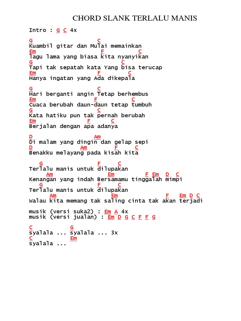 Slank Terlalu Manis Suka Suka Chord Dasar Kunci Gitar Lirik Lagu C Chordtela Pdf