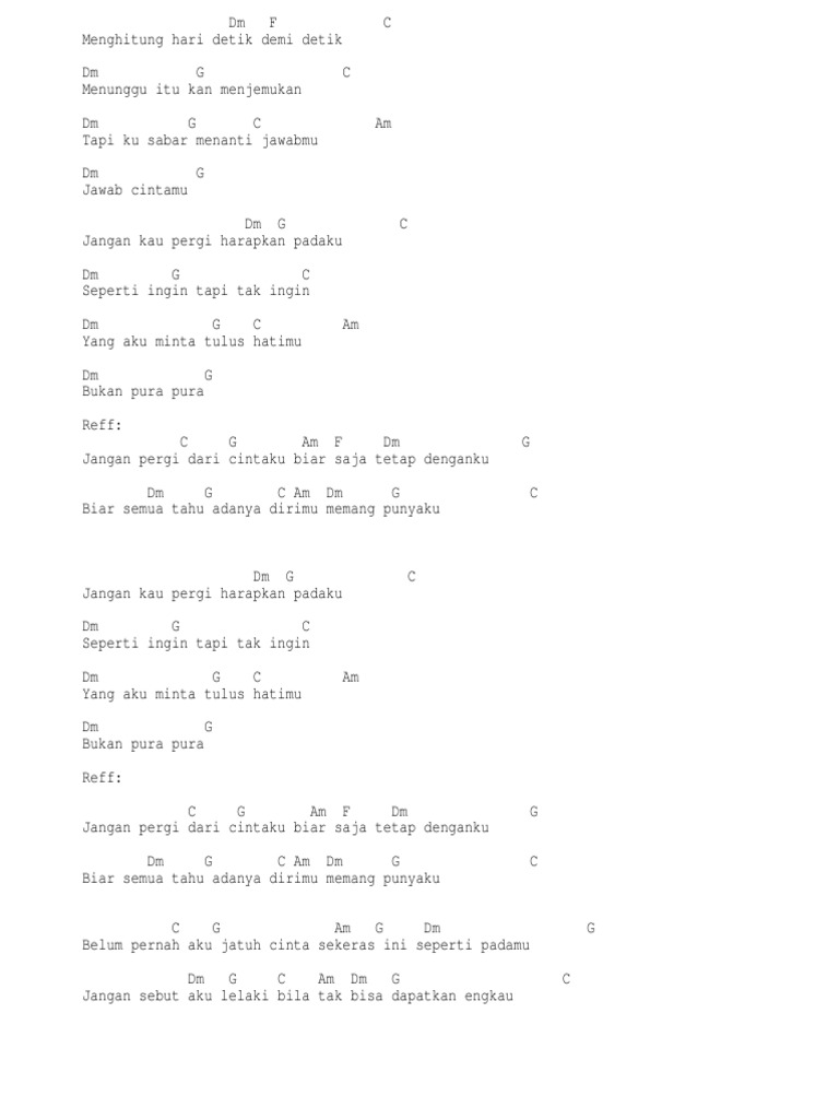 C G Am Em F C Dm G. Am Em Am D. Intro Dm Am Dm G Dm G C Menghitung hari detik demi detik Dm G C Menunggu itu kan menjemukan Dm G C Am Tapi ku sabar menanti jawabmu Dm G Jawab cintamu Dm G C Jangan kau beri harapkan padaku Dm G C Seperti ingin tapi tak ingin Dm G C Am Yang aku minta tulus hatimu Dm G Bukan pura pura.