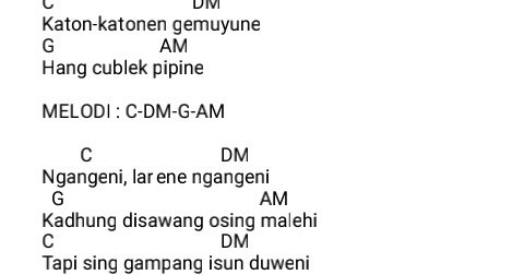 Kabeh iki mergo lagi kahanan D F Dm Gm Dek ngertio. Am G Am senajan mung guyonan F G C kowe ngucap ngajak sesandingan. Am G Am F G C.