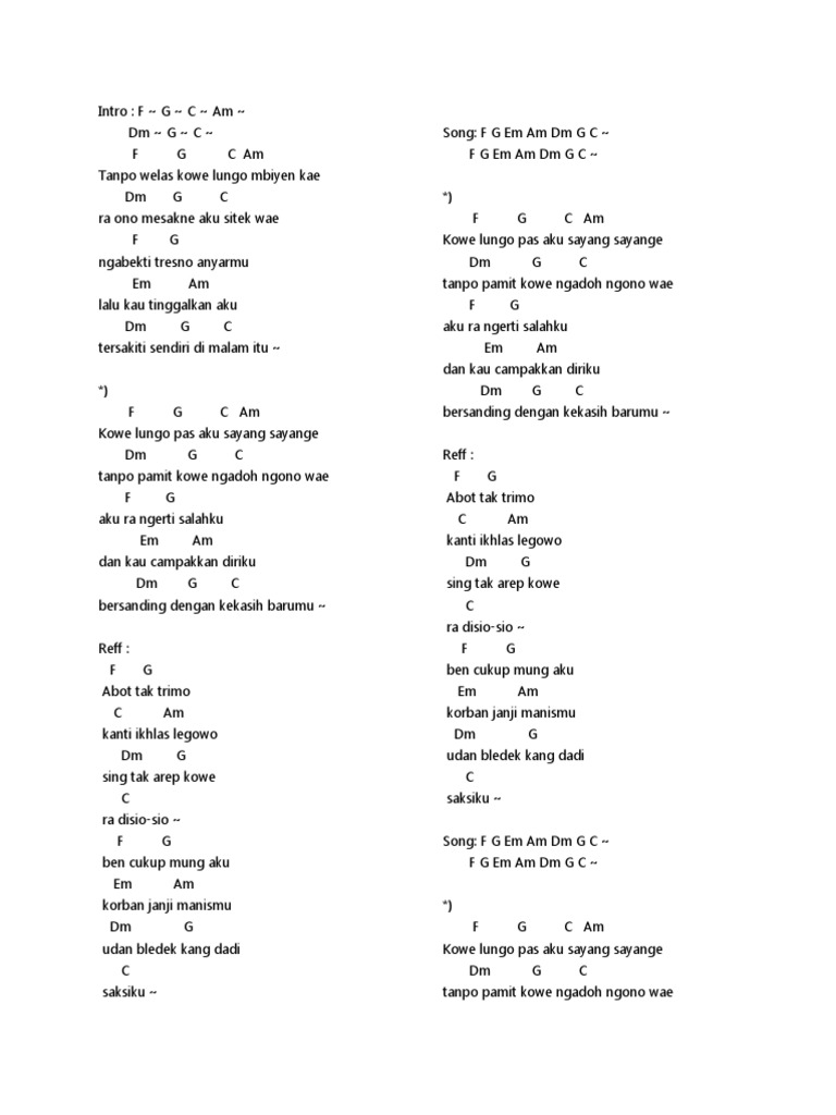 Chorus F G opo kowe ora rumongso Em Am nek pancen kowe sing salah Dm G C bubaran wae nek koyo ngene carane. Terdapat juga fitur autoscroll yang membuat halaman chord otomatis turun kebawah dan dapat diatur kecepatannya. Entah sampai kapan aku tetap menanti.